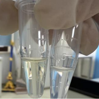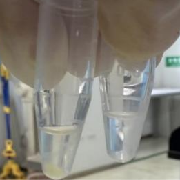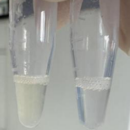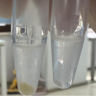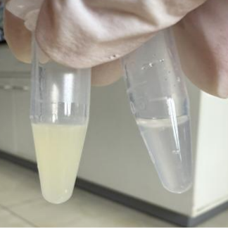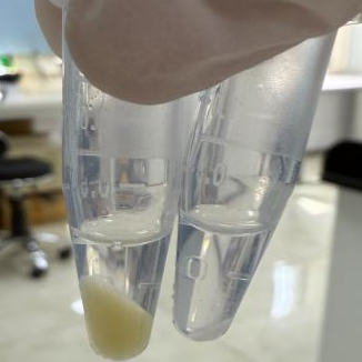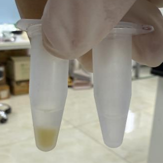 图片中左侧为细胞数量是2×106个数的CHO-S细胞(黄色细胞沉淀);图片右侧为细胞数量1×105个数的Raw(白色细胞沉淀),作为反面对照,细胞个头较小,数量太少,对后续提出的蛋白浓度以及核浆分离结果有较大的影响。