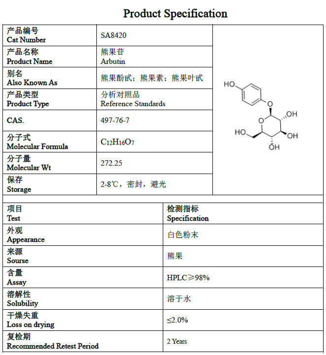 - 别名 : 对苯二酚-β-D-葡萄糖苷;熊果酚甙;4-羟苯基-β-D-吡喃葡萄糖苷
