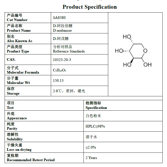 - 别名 : D-树胶醛糖;D-阿糖;D-阿戊糖;D-树脂醛糖